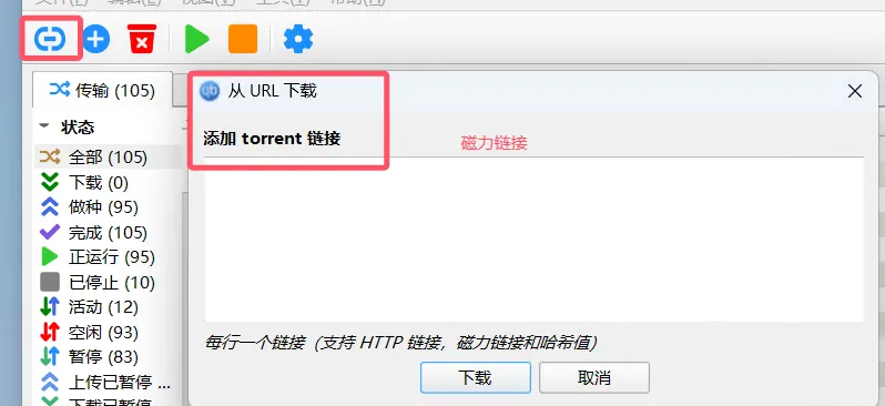 现在我们再次回到主页面,再次看到右上角,我们获取到的磁力链接/种子输入到qittorrent中,即可开始下载。