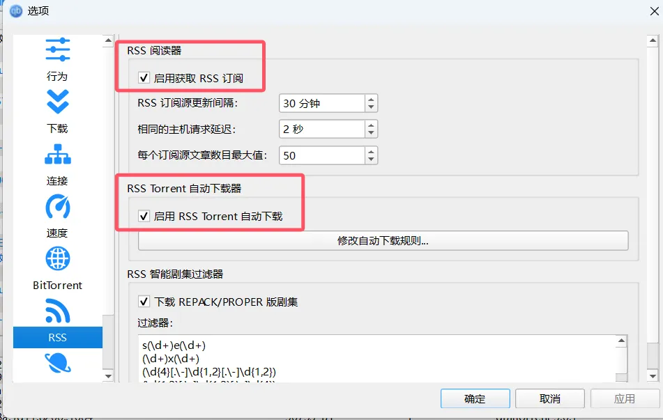 启用qbittorrent rss,我们先去设置里面,找到RSS,勾选启用获取RSS订阅。如果后续还想设置自动下载,那么也将启用RSS Torrent自动下载勾选上。