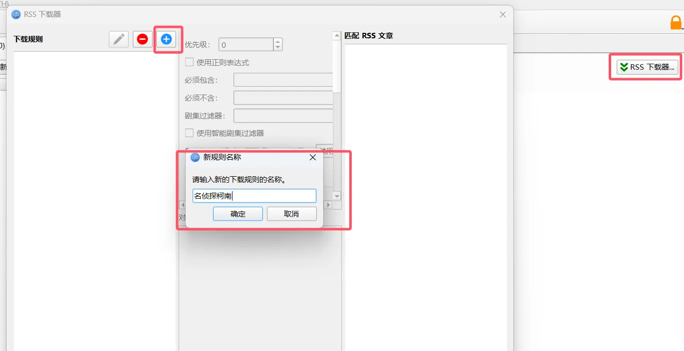 如果前面把rss自动下载也勾上了,那么我们可以对每一个rss链接进行单独的设置,让qbittorrent自动下载。我们点击rss下载器,新建一个规则,并命名。