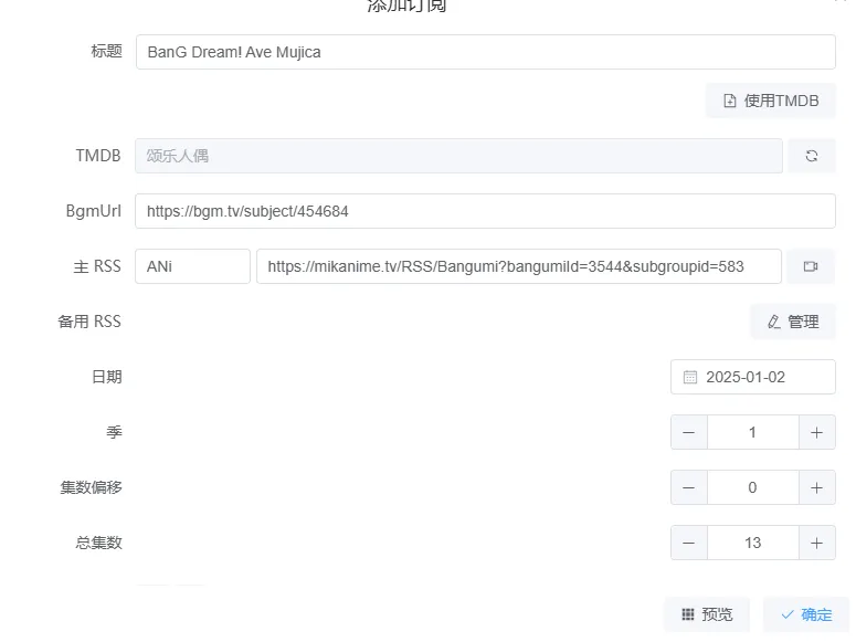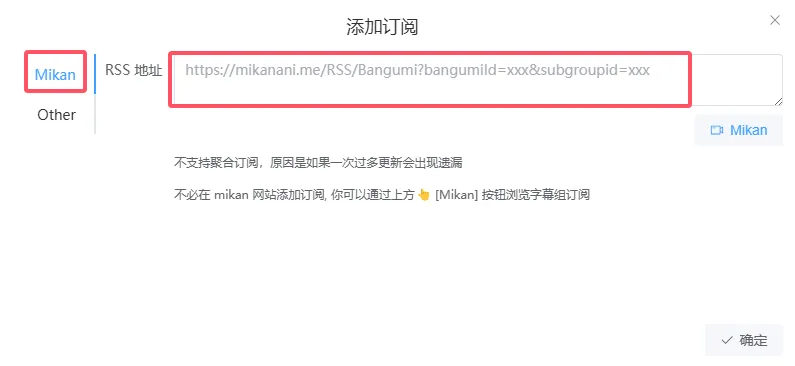 弹出的页面中,第一个是Mikan计划的rss解析,我们可以到蜜柑计划中找到相关番剧的rss,在rss地址中输入并点击确认后,ass会自动在解析该rss连接并根据蜜柑计划中信息自动配置好大部分设置。
