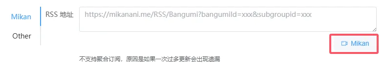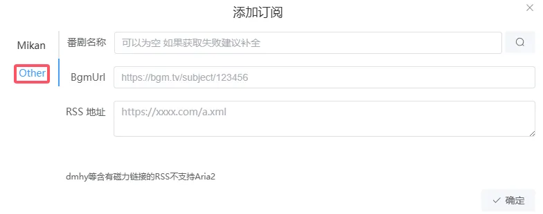 当然,番剧rss订阅很多地方都有,我们也可以不用蜜柑的源,用其他的也可以,选择other并写入rss以及相关信息即可,可参考上面的配置