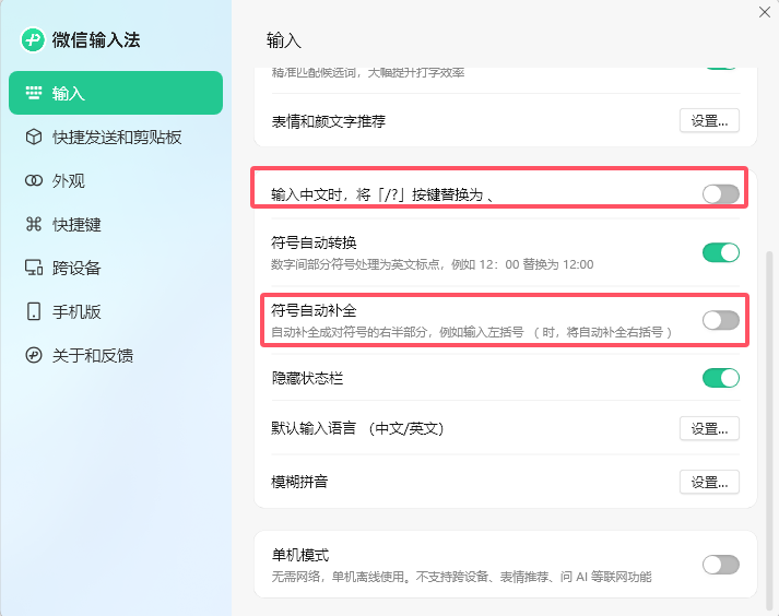 并且它还解决和改进了一些微软输入法的痛点,比如:在输入>默认输入语言中可以设置始终使用英文标点符号。这对于特定场景非常有用,例如~~写点代码的时候便不用担心标点符号输入错误导致排查半天的问题。~~