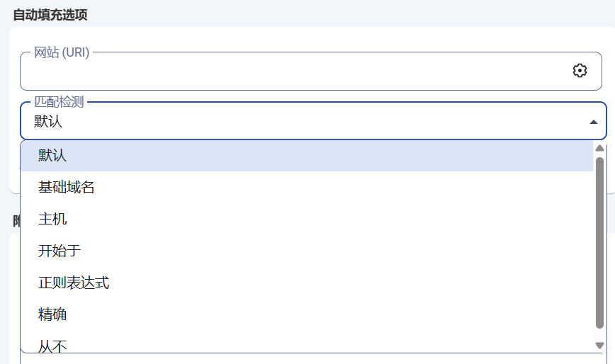 值得注意的是,默认的网站识别也是基于基础域名,也就是主域名,这一点跟edge等一众浏览器自带的密码管理器是一样的。点击后方的齿轮样式图标即可匹配检测更改检测机制。