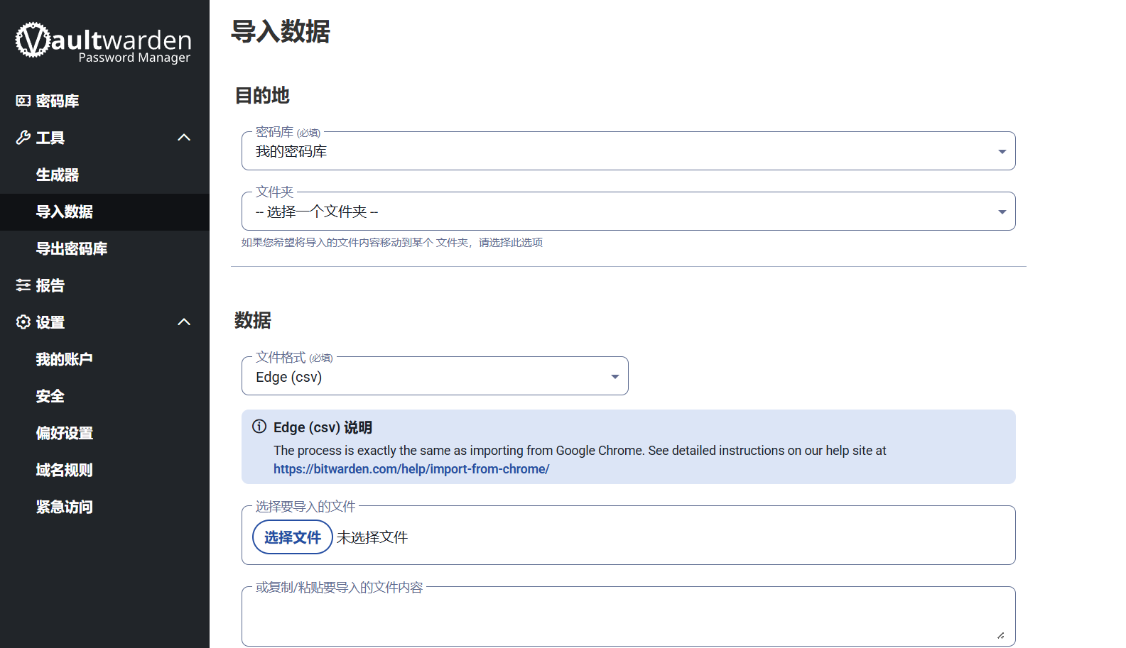 回到vaultwarden页面,点击工具>导入密码,选择刚刚导出的csv文件,并在上方的文件格式选择egde,然后点击导入数据即可。
