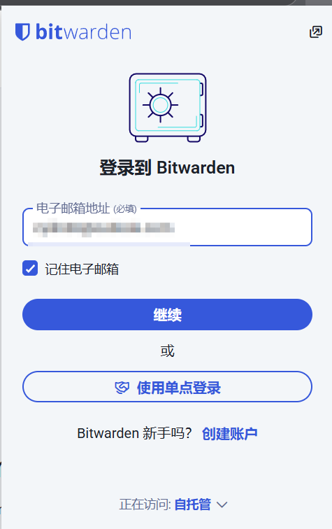 以浏览器插件为例,我们需要下方的“正在访问“选择”自托管“,并填写自己设置的vaultwarden的域名。