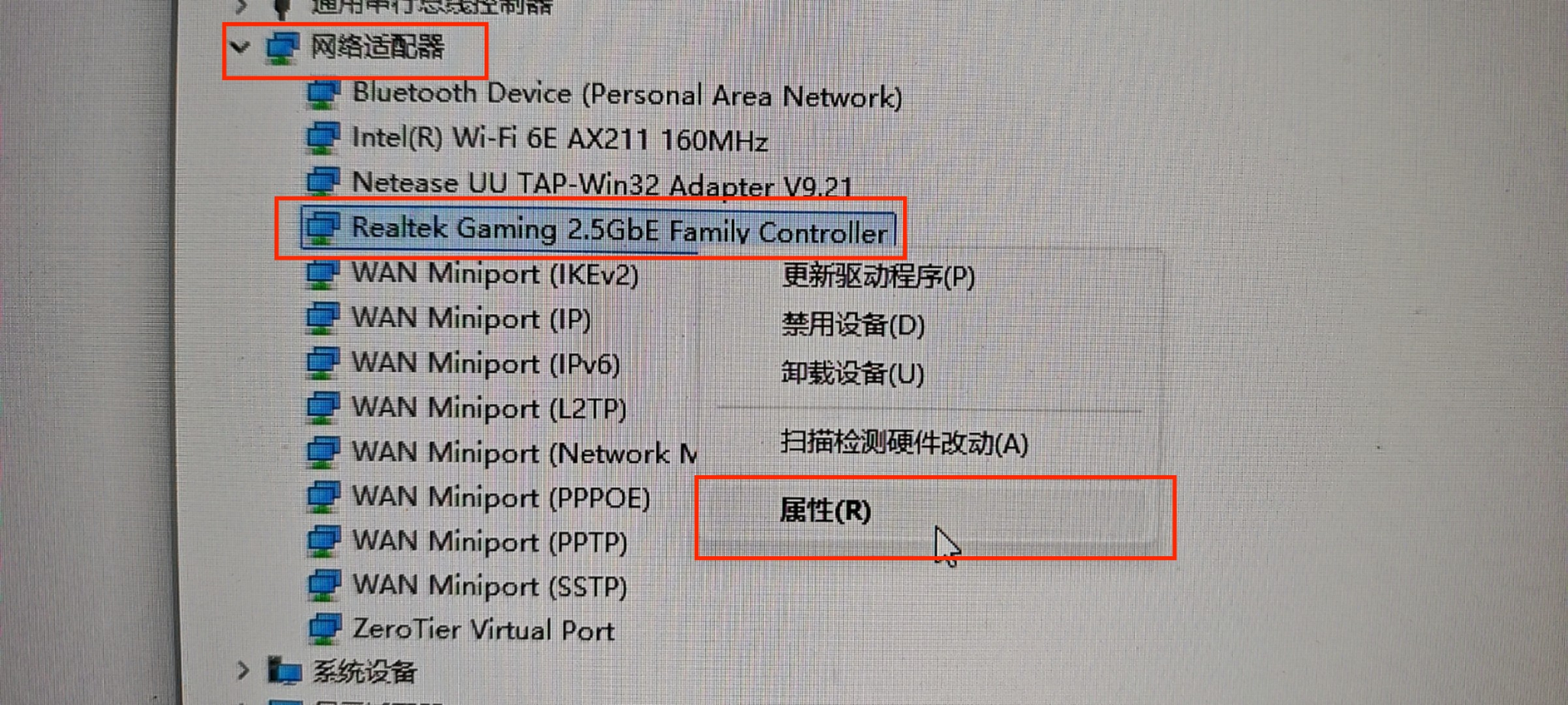 我们在设备管理器中打开网络适配器,右键你的网卡,点击属性