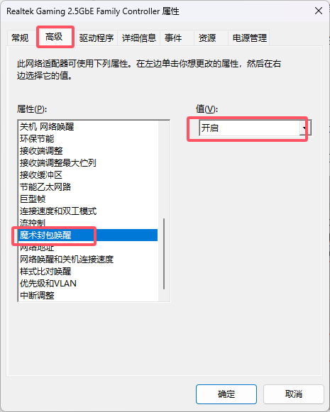 点击高级选项卡,选到魔术封包唤醒,并设置为开启