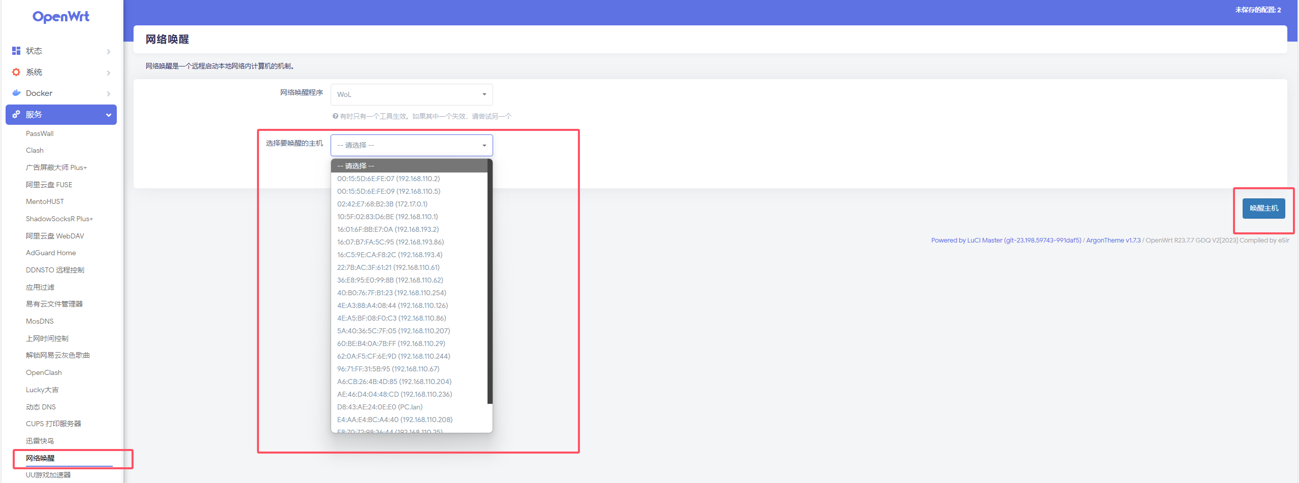 我们进入openwrt的后台,找到网络唤醒,然后选择进入被控设备的ip/mac地址,最后点一下唤醒主机即可。